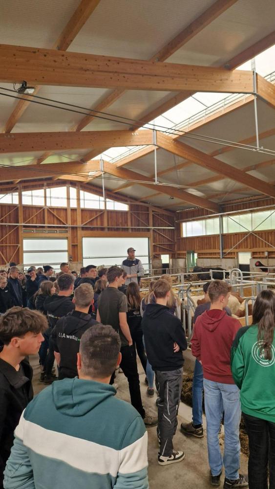 Die Anreise nach Kärnten erfolgte im gemeinsamen Bus mit dem Bildungszentrum Hohenems und der LLA Weitau. Bereits am Anreisetag erhielten die Schülerinnen in St. Wolfgang im Lavanttal eine interessante Betriebsbesichtigung am Betrieb der Familie Hassler (vlg. Binder). Der moderne Milchviehbetrieb wurde im Jahr 2024 neu errichtet und umfasst rund 50 Milchkühe mit eigener Nachzucht. Am Betrieb werden die Rassen Fleckvieh, Brown Swiss, Holstein, Jersey und Pinzgauer gehalten. Zusätzlich bewirtschaftet die Familie rund 75 Hektar Acker- und Grünland und betreibt eine Direktvermarktung mit Schwerpunkt auf Kürbisprodukte.